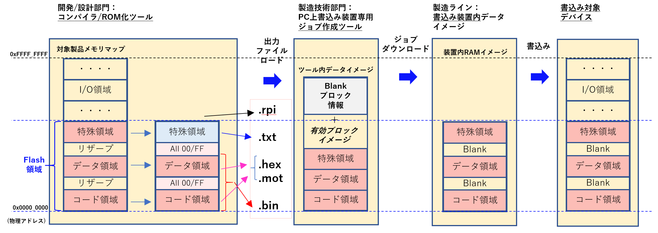 デジタル製品製造の際にそのコアとなるプログラムやデータはその製造工程の中で各種のROM-マイコン内蔵Flashメモリ、シリアルFlashやNORFlash、あるいは、大容量eMMC/UFSへの書込みを行わなければなりません。