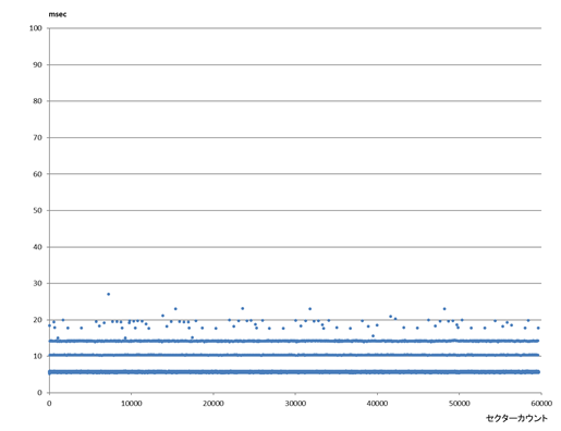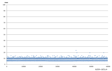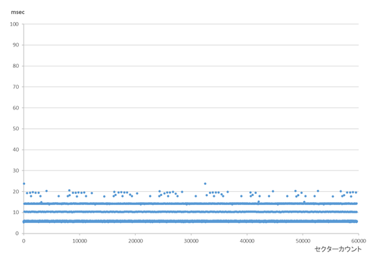 一般的にマネージドNANDでは個体ごとに書込み/読出し時間が大きくばらつきます。また、完全ブランク状態から複数回フルサイズ書込み/読出しを行わないと時間がばらつきます。複数回アクセスを行いアアクセス時間が安定した段階でマップを作製します。