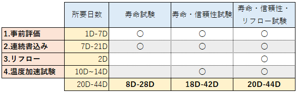 お客様のご要望に応じて「寿命試験」、「寿命・信頼性試験」、「寿命・信頼性・リフロー試験」の3パターンからお選び頂けます。