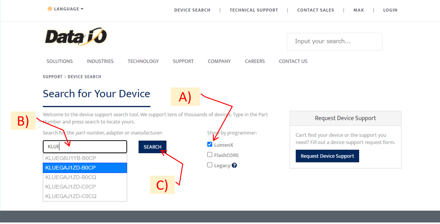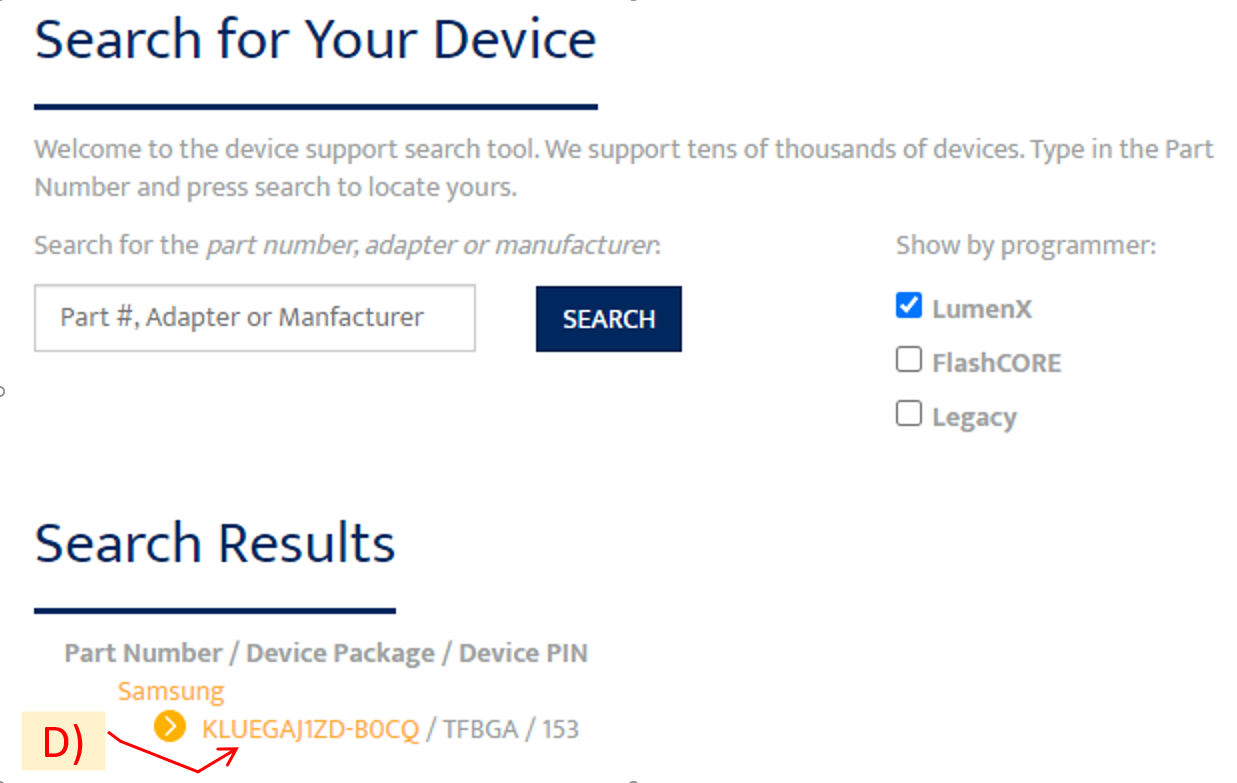 Data I/O社デバイス検索サイトをクリック: http://www.dataio.com/Support/Device-Search
